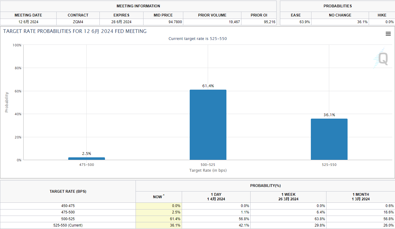 周一公布的数据显示,3月美国制造业活动出现一年半以来的首次扩张,美元应声跳涨。数据公布后,交易商认为6月降息的可能性从之前的60%左右降至58%,这种情况通常会令不孳息黄金承压。但周二美联储官员的讲话和就业数据温和放缓,令美联储6月份降息预期小幅回升至64%附近。