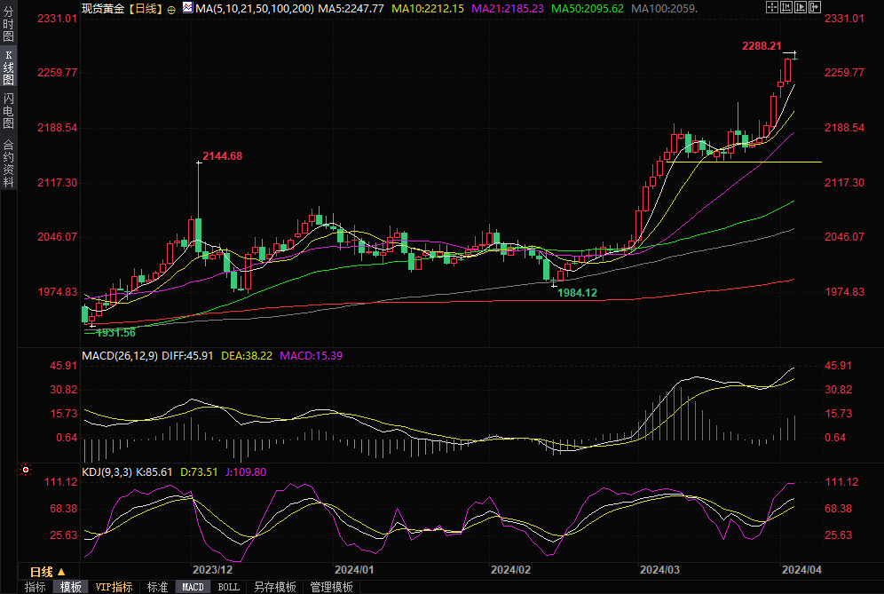 现货黄金继续冲高,一度刷新历史高点至2288.21美元/盎司,目前交投于2280.34美元/盎司附近,交易商在中东紧张局势加剧之际抢购避险黄金,基本不在意美元走强和对美国的降息押注缩减。
