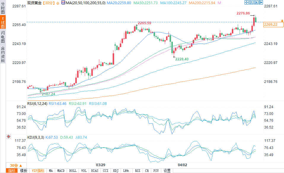 现货黄金报2266.88美元/盎司,涨幅0.70%。