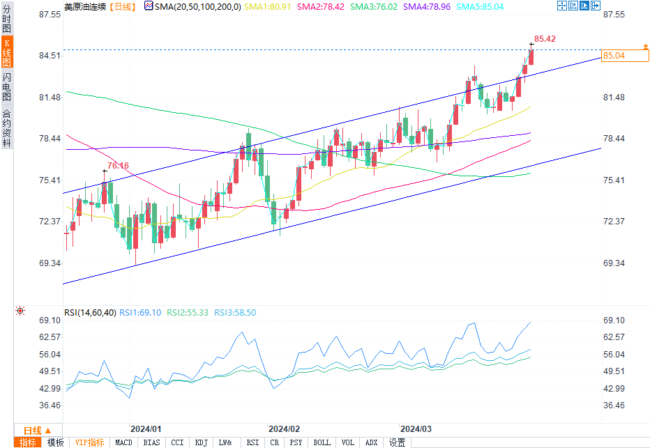支撑:84.57;83.58;83.10;82.24北京时间21:05,WTI原油期货报85.15美元每桶,涨幅1.41%。