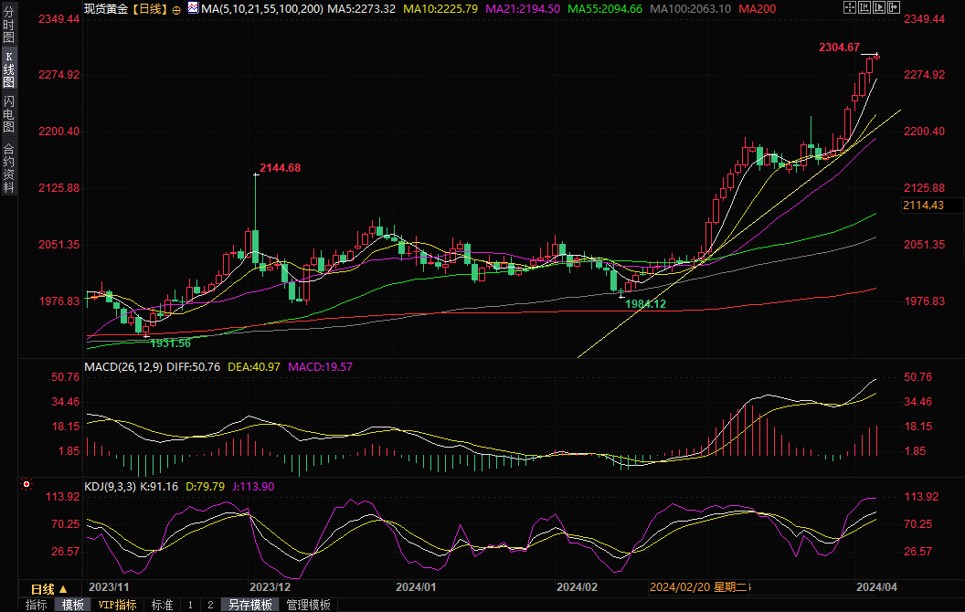 美元指数持续受压,而黄金价格则创下历史新高,一度接近2305美元/盎司。这一行情背后,是美联储主席鲍威尔再次重申了对今年降息的可能性,给市场投资者带来了鸽派的信号。