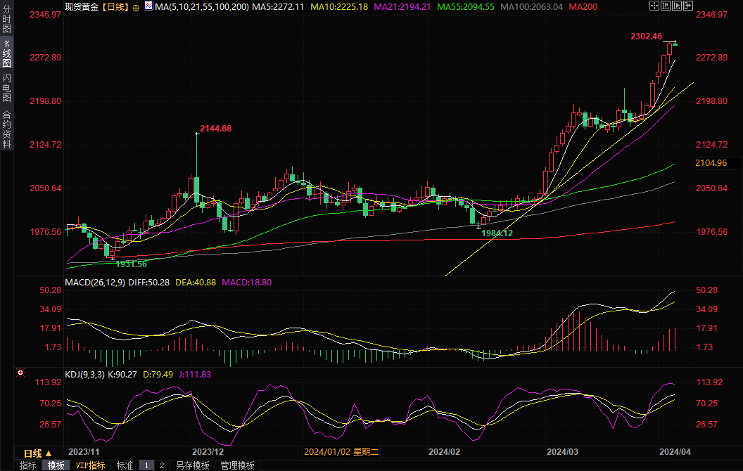 现货黄金维持强势,一度刷新历史高点至2302.46美元/盎司,目前交投于2297.02美元/盎司附近;金价周三延续刷新纪录高位的势头,对通胀压力的担忧提振了对黄金的对冲需求,美国服务业增长在3月份进一步放缓,