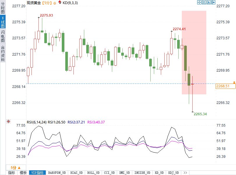 现货黄金短线走低3美元,报2269美元/盎司,随后反弹回到2270关口上方,后再度回落。此前