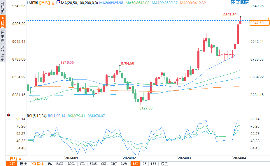 数据显示,美精铜盘中报4.2355美元/磅,涨幅0.99%。伦敦金属交易所(LME)铜价盘中上涨超1%,达到每吨9397.5美元。两者创下自2023年1月以来新高。