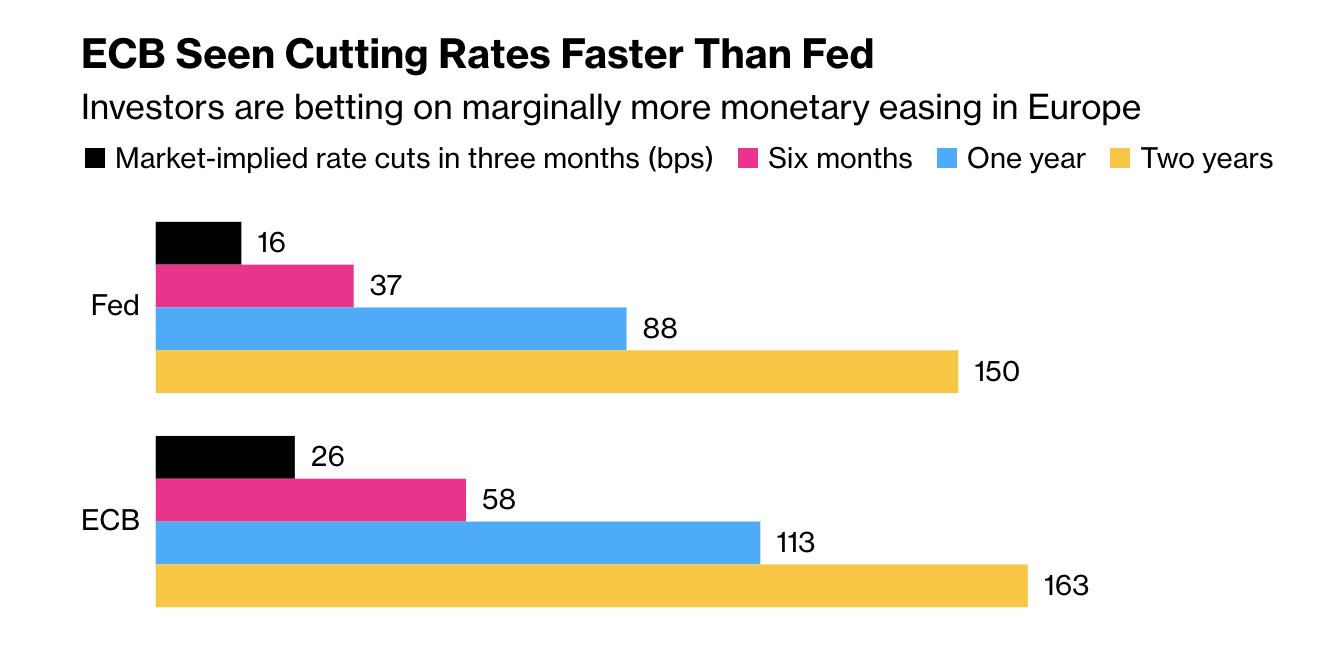 交易员们大胆预测欧洲央行今年可能会实施四次降息。然而,在鲍威尔周三重申不急于降低借贷成本之后,他们对美联储是否会降息两到三次感到困惑。