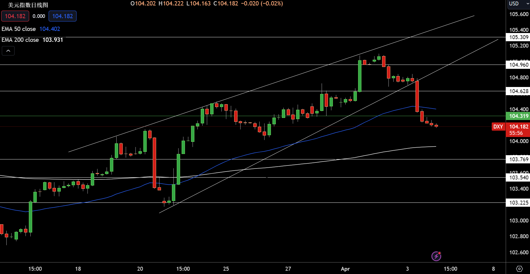 美元指数小幅下跌至104.130,阻力位位于104.63、104.96和105.31,暗示潜在的上行障碍。