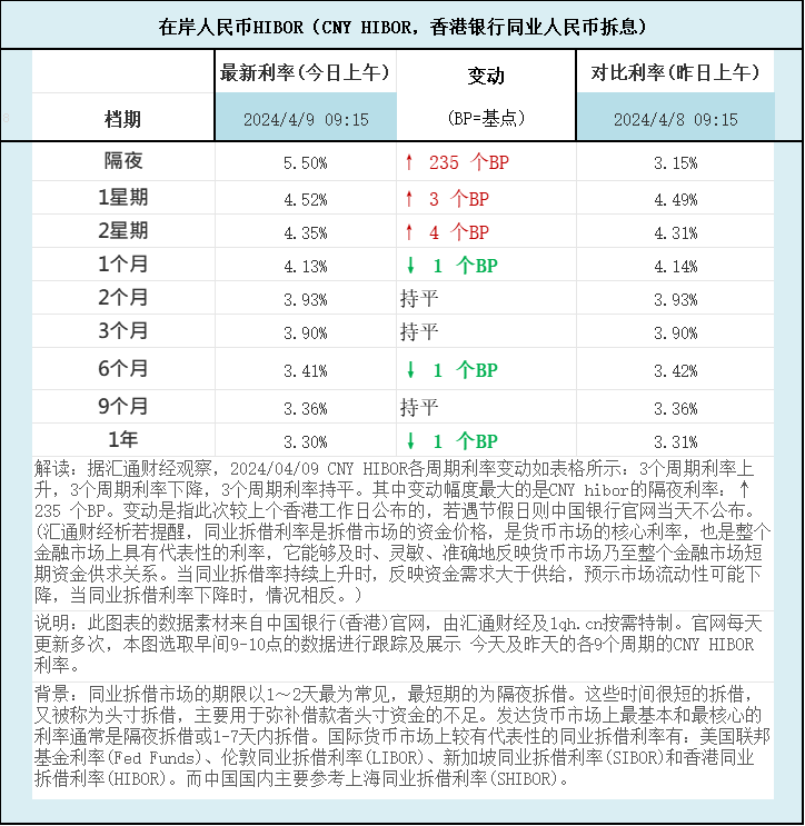 人民币香港银行间同业拆借利率(CNY HIBOR)及变动一览:据汇通财经观察,2024/04/09 CNY HIBOR各周期利率变动如表格所示:3个周期利率上升,3个周期利率下降,3个周期利率持平。其中变动幅度最大的是CNY hibor的隔夜利率:↑ 235 个BP。如图更新的数据显示,隔夜在岸人民币HIBOR报5.50%,升235个BP;1星期报4.52%,升3个BP,2星期报