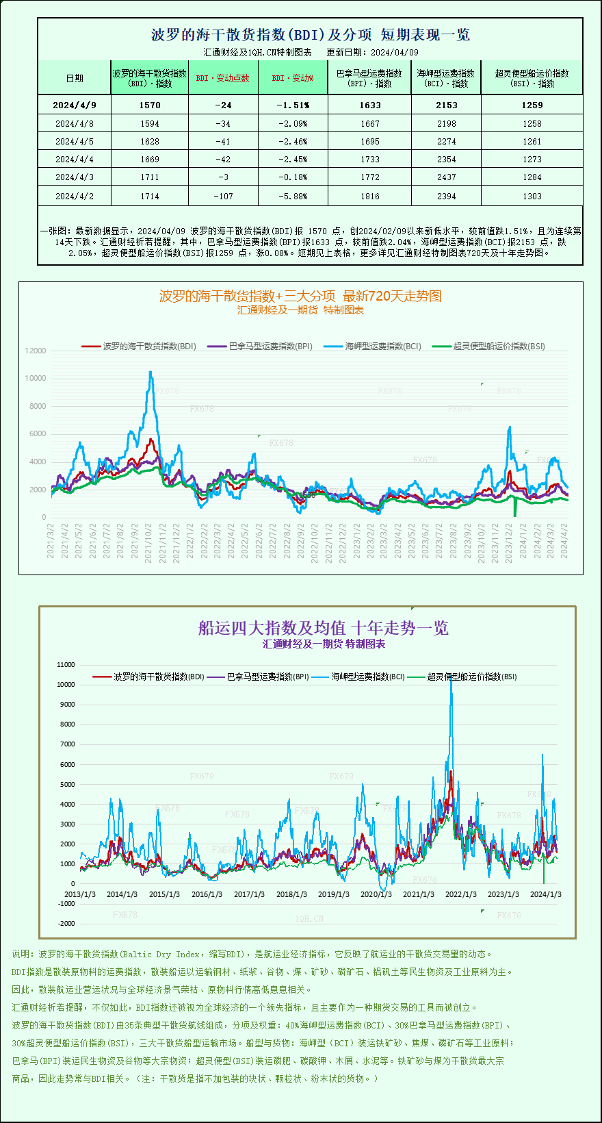 汇通财经APP讯——最新数据显示,2024/04/09 波罗的海干散货指数(BDI)报 1570 点,创2024/02/09以来新低水平,较前值跌1.51%,且为连续第14天下跌。其中,巴拿马型运费指数(BPI)报1633 点,较前值跌2.04%,海岬型运费指数(BCI)报2153 点,跌2.05%,超灵便型船运价指数(BSI)报1259 点,涨0.08%。波罗的海干散货指数+三大分项的最新720天走势图、十年走势图等详见汇通财经特制图表。
