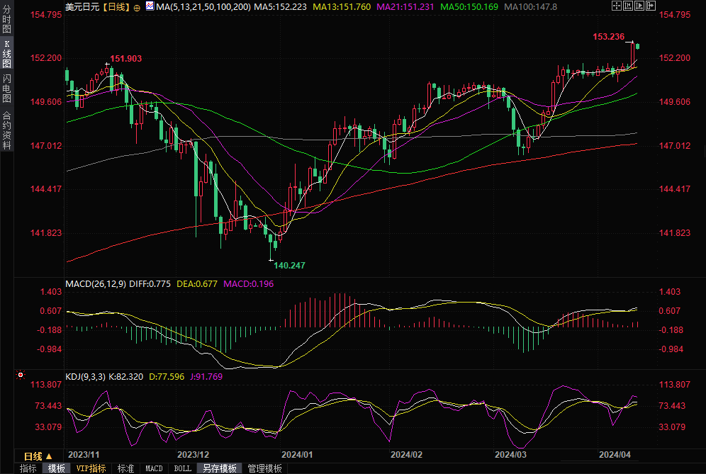 汇通财经APP讯——美元/日元周三(4月10日)一度飙升至153.24,因美国CPI升幅超出预期,美联储6月降息预期降温,美债收益率飙升,美元全线上涨,双双刷新近五个月高点附近。周四(4月11日)亚市,