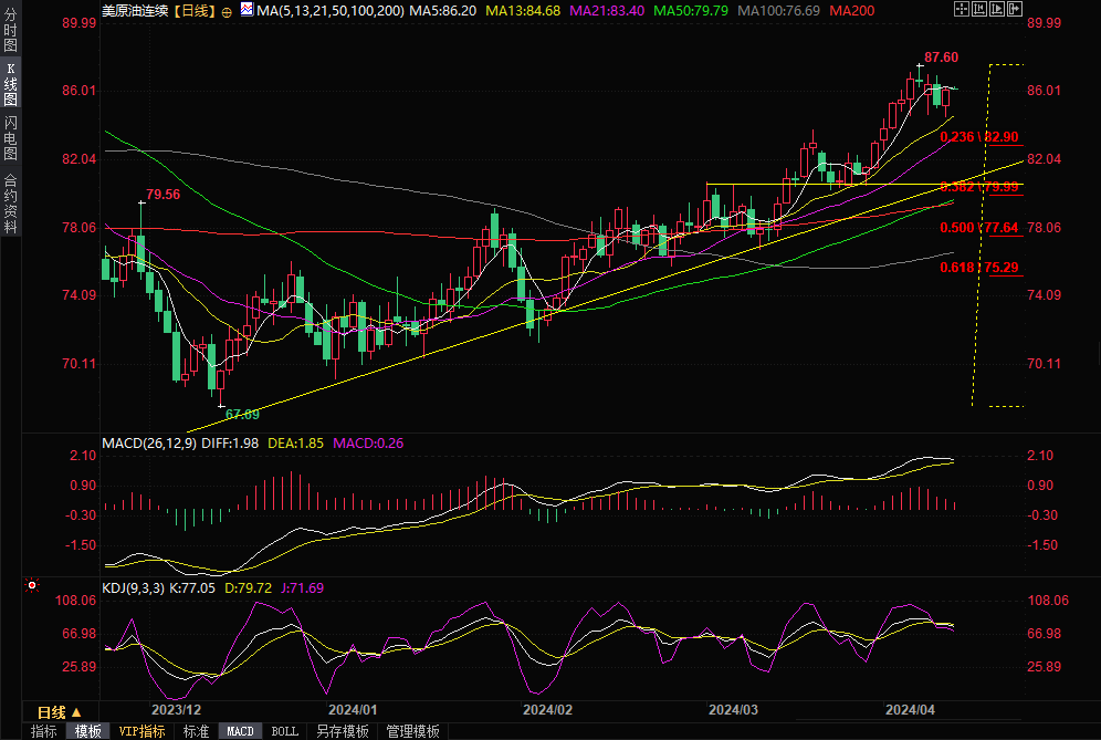 美原油窄幅震荡,目前交投于86.22美元/桶附近,油价周三收涨逾1%,此前哈马斯一位领导人的三个儿子在以色列对加沙地带的空袭中丧生,加剧了人们对停火谈判可能陷入僵局的担忧,不过,美国CPI强于预期帮助美元大涨,而且EIA原油库存大幅增加,仍需警惕油价的回调风险。