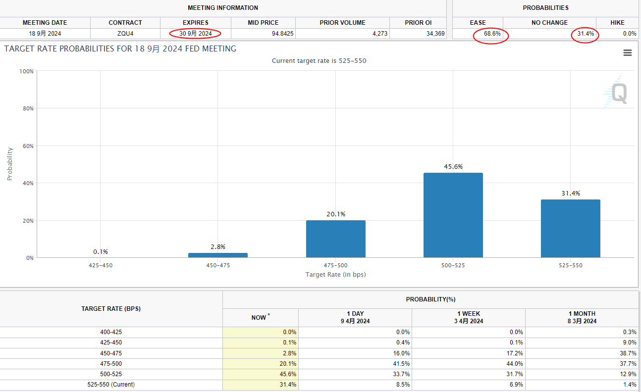会议记录称,“与会者注意到,有指标显示经济势头强劲,但最近几个月的通胀读数令人失望”,同时重申他们需要对通胀持续放缓有更大的信心,然后才会降息利率期货显示,美联储5月份维持利率不变的概率为96.8%,6月份维持利率不变的概率已经升至81.1%,7月份维持利率不变的概率升至55.1%,而9月份降息的概率也仅68.6%。
