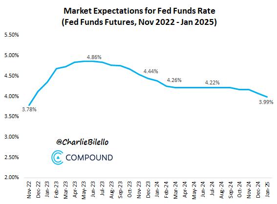 正如Compound Capital Advisors创始人兼首席执行官Charlie Bilello在最新推文中所提到的,当前利率市场的定价显示,美联储可能在明年2月和3月再分别加息25个基点,随后将进入一段为期约半年的等待和暂停期,而到了明年11月,美联储就将开启降息周期,并一路持续到2024年。
