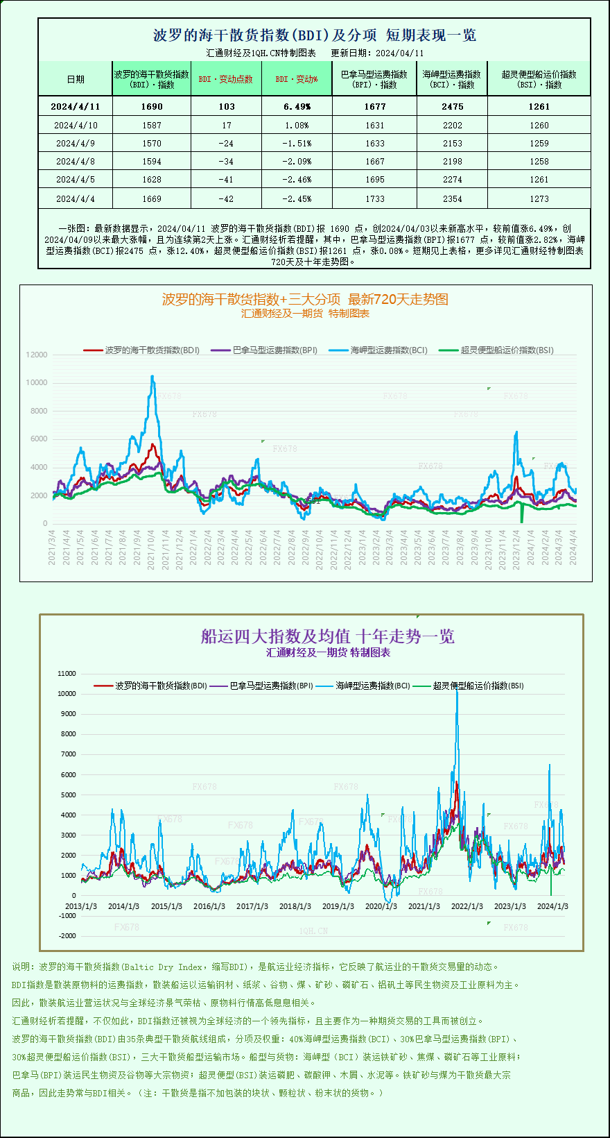 汇通财经APP讯——最新数据显示,2024/04/11 波罗的海干散货指数(BDI)报 1690 点,创2024/04/03以来新高水平,较前值涨6.49%,创2024/04/09以来最大涨幅,且为连续第2天上涨。其中,巴拿马型运费指数(BPI)报1677 点,较前值涨2.82%,海岬型运费指数(BCI)报2475 点,涨12.40%,超灵便型船运价指数(BSI)报1261 点,涨0.08%。波罗的海干散货指数+三大分项的最新720天走势图、十年走势图等详见汇通财经特制图表。