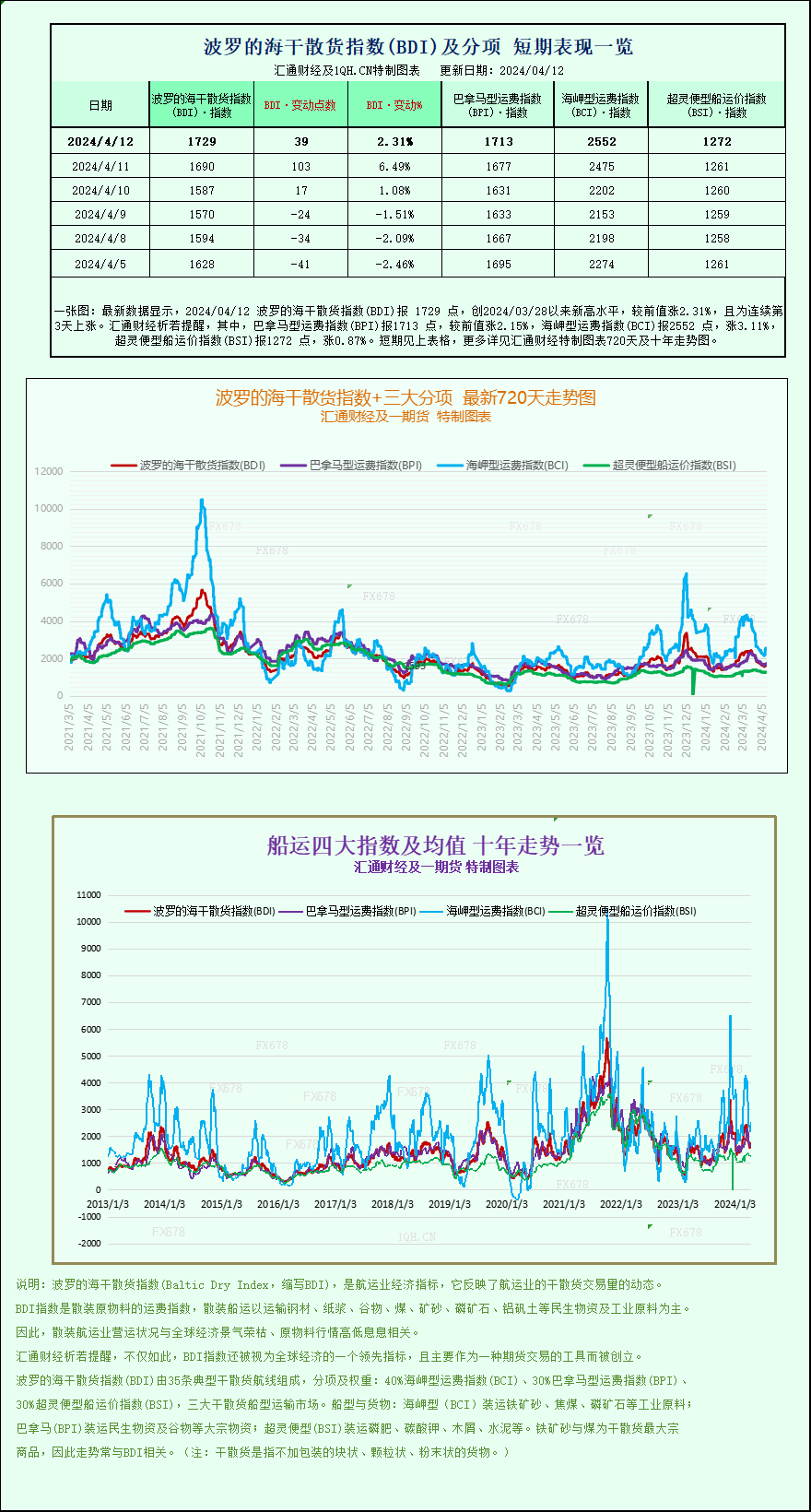 汇通财经APP讯——最新数据显示,2024/04/12 波罗的海干散货指数(BDI)报 1729 点,创2024/03/28以来新高水平,较前值涨2.31%,且为连续第3天上涨。其中,巴拿马型运费指数(BPI)报1713 点,较前值涨2.15%,海岬型运费指数(BCI)报2552 点,涨3.11%,超灵便型船运价指数(BSI)报1272 点,涨0.87%。波罗的海干散货指数+三大分项的最新720天走势图、十年走势图等详见汇通财经特制图表。