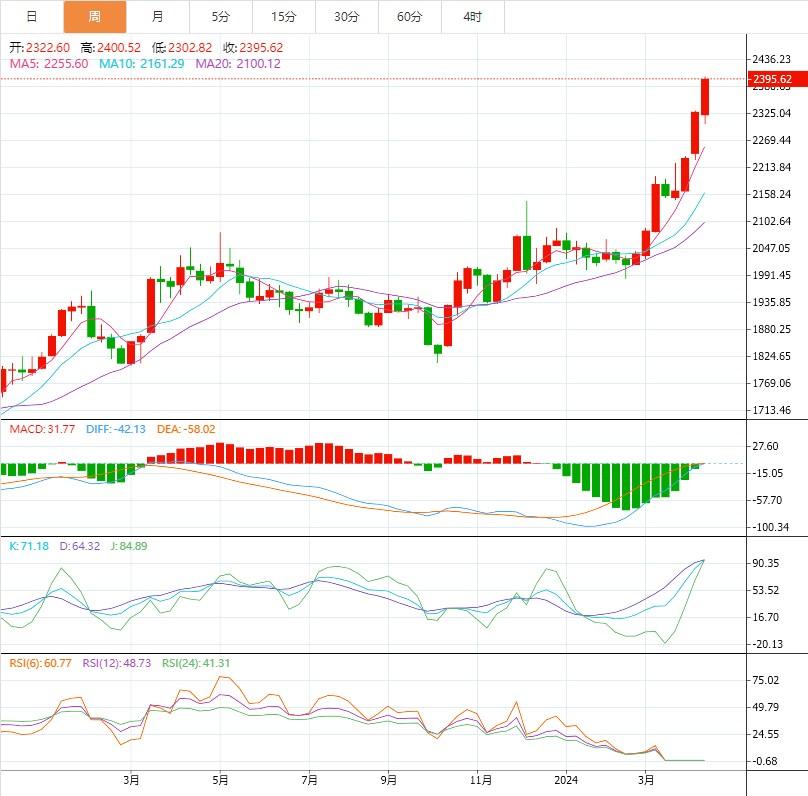 现货黄金价格上涨近1%,至2395.04美元/盎司,稍早曾触及2400.52美元的历史高位。本周黄金价格涨幅近3%。