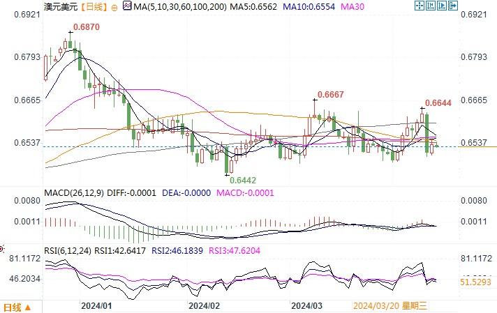 纽约盘阶段上涨0.38%收盘于0.6536。澳元是周四表现最好非美货币。对中国刺激政策的希望推高了铁矿石价格,为澳元提供支撑。此外,由于投资者将对美联储今年降息幅度的押注大幅削减至仅42个基点,相当于不到两次降息。澳洲也呼应这样的大幅转变,投资者开始将澳洲央行首次降息时间的预估推迟到12月,隐含的机率为90%,意味着他们并不全然确定今年会降息一次。息差上有望不被拉大的预期,也稍稍有助于澳元/美元稳住了下跌的脚步。目前日线图上,澳元/美元周三虽然大跌,但整体上还是处在此前宽幅横盘震荡区间内,目前汇价受阻于移动均线阻力位0.6553处在布林带通道中轨线之下,走势偏弱。下方初步支撑位在0.6475/80,目前看有一定的逢低买入盘撑持着澳元,使之不至于坠入更低水平。