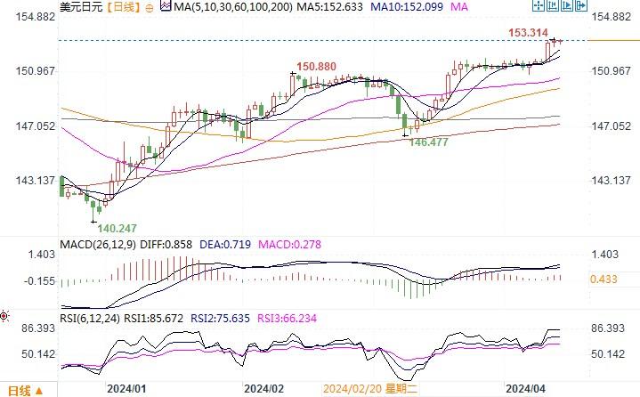 持平于153.23。周四公布的数据显示,3月生产者物价指数(PPI)环比上升0.2%,路透调查的经济学家之前预计为上升0.3%。PPI同比上涨2.1%,预期为上涨2.2%。PPI数据公布后美元曾下跌,但随后反弹。因为另一份报告显示,截至4月6日当周,美国初请失业金人数为21.1万人,预期为21.5万人,反映出劳动力市场仍持续紧张。目前投资者关注焦点还是在通胀的发展上。根据芝商所(CME)的FedWatch工具,PPI数据公布后,美国利率期货市场预计美联储9月降息概率为69%左右。在周三公布的3月CPI涨幅高于预期后,市场上出现了9月首次降息的预期。数周来利率期货市场一直消化的预期是6月首次降息。联邦基金利率期货市场还削减了今年降息次数预期,从几周前的约三到四次,每次25个基点,减少到不到两次,累计约42个基点。为此,超宽利率差驱使美元/日元保持走高态势。日线图上,美元/日元冲向布林带通道上轨线,各项技术指标似乎开始向上摆动,显示美元多头开始蠢蠢欲动。若市场上美元多头动能强,预料日本央行暂时不会认为是干预的好时机,美元/日元仍有望继续向高峰攀升。