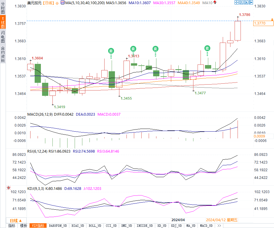 由于市场对加拿大央行将于6月降低借款利率的预期坚定,加元汇率呈现走弱态势。美元/加元飙升至自去年11月以来的最高水平,现报1.37661,涨幅0.57%。在周三加拿大央行维持利率现状后,行长麦克勒姆表示6月份可能会实施降息措施。