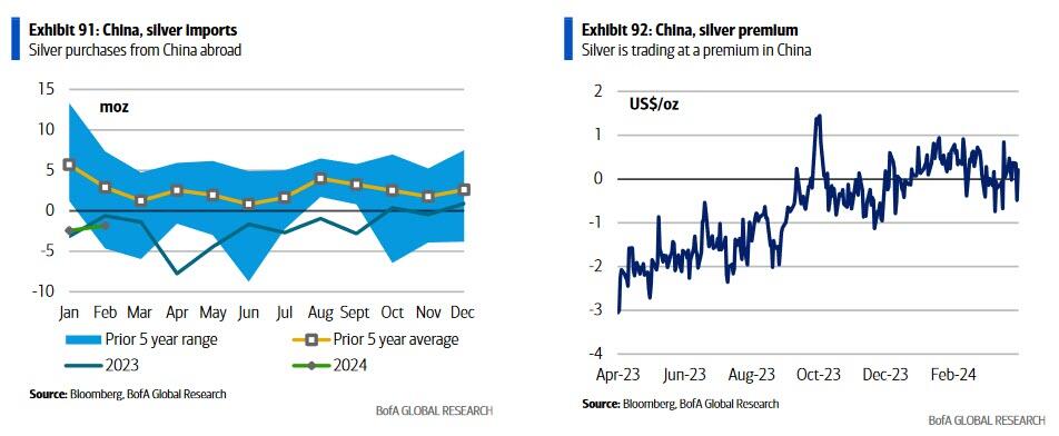 美国银行大宗商品策略师Michael Widmer认为,未来几个月全球经济触底反弹将支撑白银市场。来自日本和美国的白银进口量已经脱离低点,并可能从此走高。同样,中国去年初是白银净出口国,但到2023年底,白银出口量有所下降。