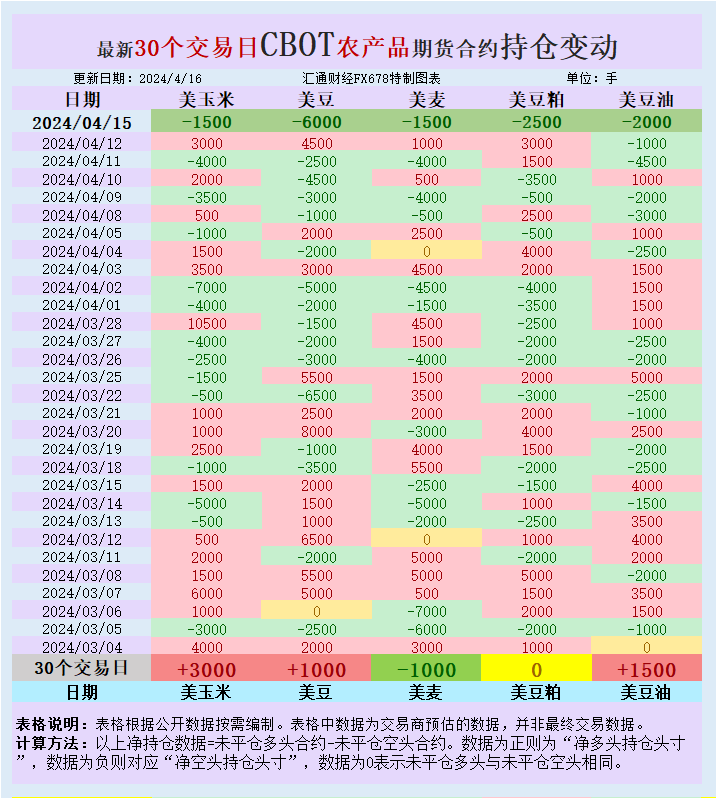 根据汇通财经观察,海外交易商估算的结果显示,本周一(4月15日),大宗商品基金增加CBOT美豆、美豆粕、美玉米、美麦、美豆油投机性净空头头寸。最新30个交易日,大宗商品基金增加美豆、美豆油、美玉米投机性净多头头寸,增加美麦投机性净空头头寸。
