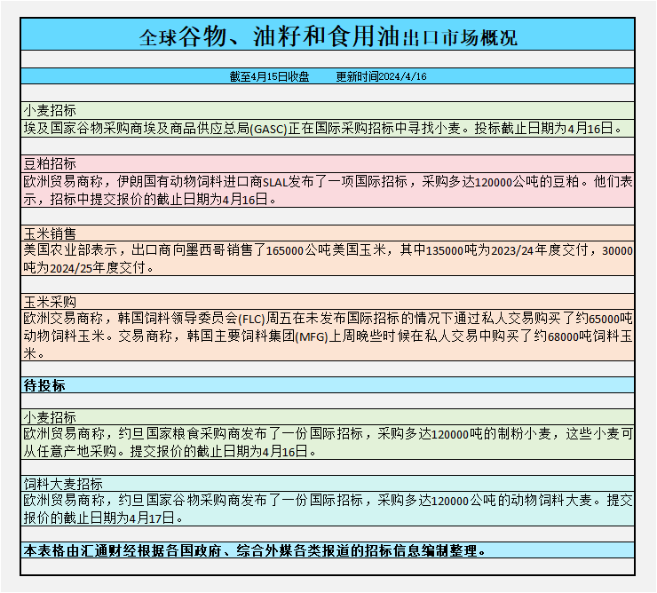 截至周一收盘,全球谷物、油籽和食用油出口市场招标、采购概况: