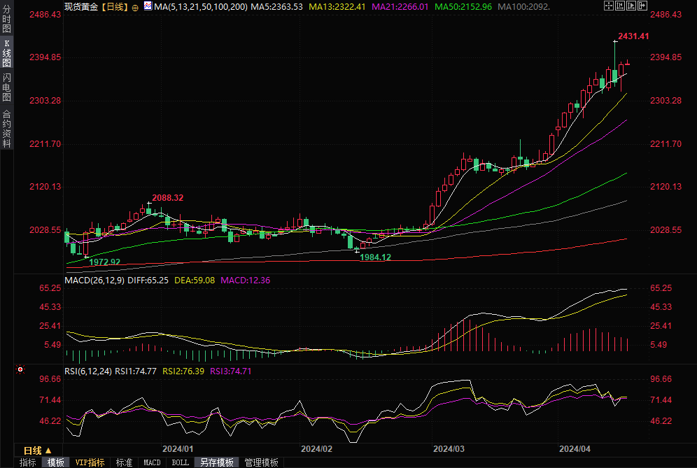 伊朗上周六夜晚对以色列发射成群的爆炸性无人机与导弹,这是三十多年来另一个国家首次对以色列发动袭击,激起了人们对出现更广泛地区冲突的担忧。因为大部分导弹和无人机被拦截,并没有造成太大损失,在各方劝说之下,原本市场的担忧情绪并没有持续升温,在美国公布强劲的零售销售数据后,金价一度跌至2324.22美元/盎司。但随着以色列的进一步表态,金价再度获得避险买盘和逢低买盘的支撑。