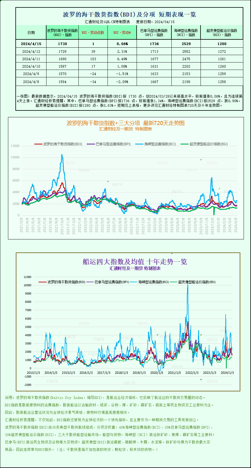 汇通财经APP讯——最新数据显示,2024/04/15 波罗的海干散货指数(BDI)报 1730 点,创2024/03/28以来新高水平,较前值涨0.06%,且为连续第4天上涨。其中,巴拿马型运费指数(BPI)报1736 点,较前值涨1.34%,海岬型运费指数(BCI)报2529 点,跌0.90%,超灵便型船运价指数(BSI)报1280 点,涨0.63%。波罗的海干散货指数+三大分项的最新720天走势图、十年走势图等详见汇通财经特制图表。