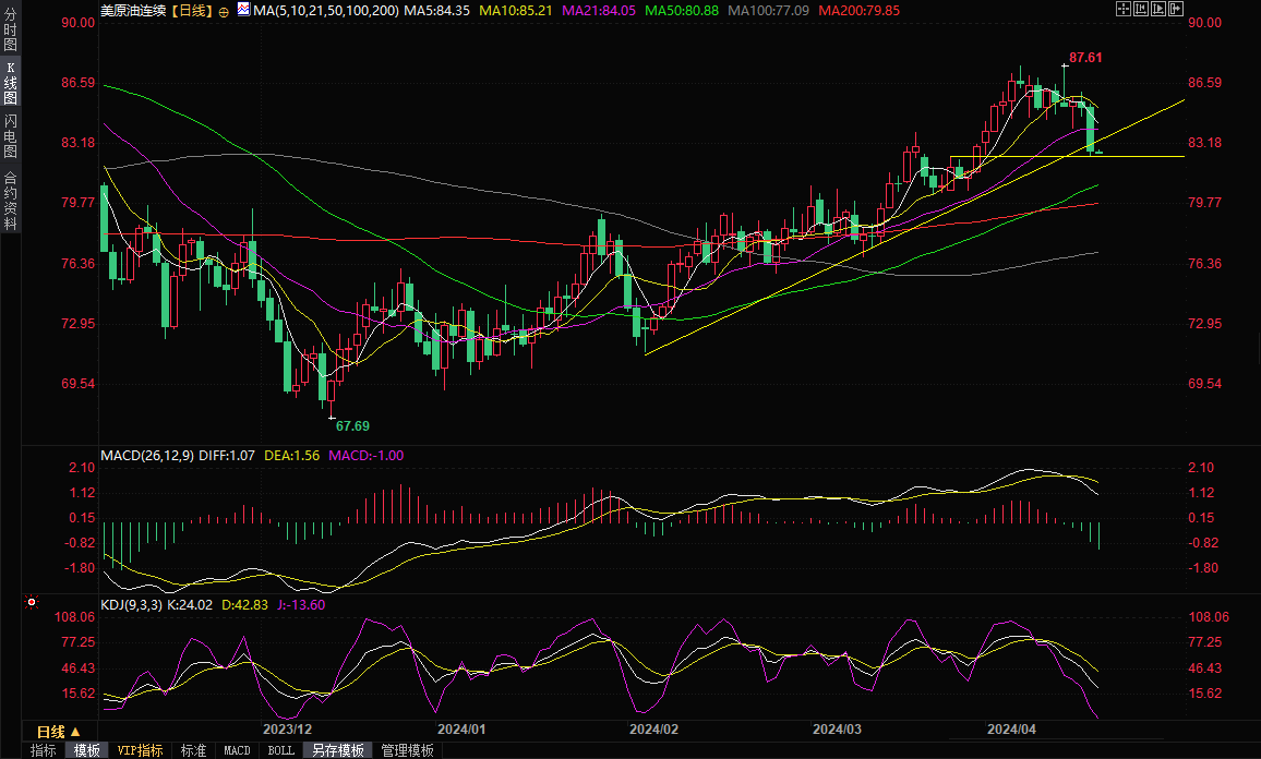 布伦特原油期货周二收跌3%,报每桶87.29美元;5月美国原油期货周二收跌2.67美元或3.1%,报每桶82.69美元,为3月20日以来最大跌幅,盘中刷新了4月份以来低点至82.53美元/桶。