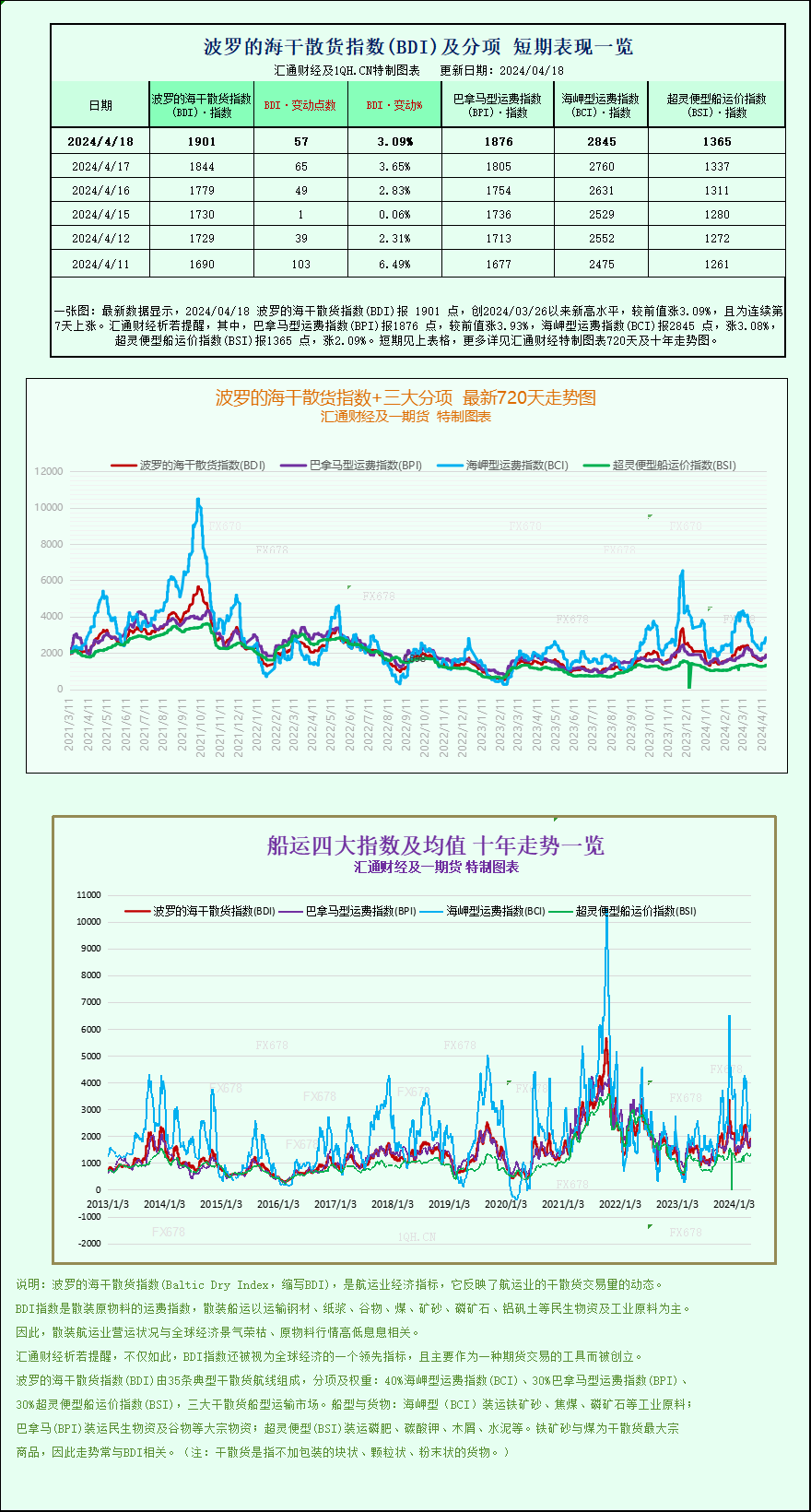 汇通财经APP讯——最新数据显示,2024/04/18 波罗的海干散货指数(BDI)报 1901 点,创2024/03/26以来新高水平,较前值涨3.09%,且为连续第7天上涨。其中,巴拿马型运费指数(BPI)报1876 点,较前值涨3.93%,海岬型运费指数(BCI)报2845 点,涨3.08%,超灵便型船运价指数(BSI)报1365 点,涨2.09%。波罗的海干散货指数+三大分项的最新720天走势图、十年走势图等详见汇通财经特制图表。