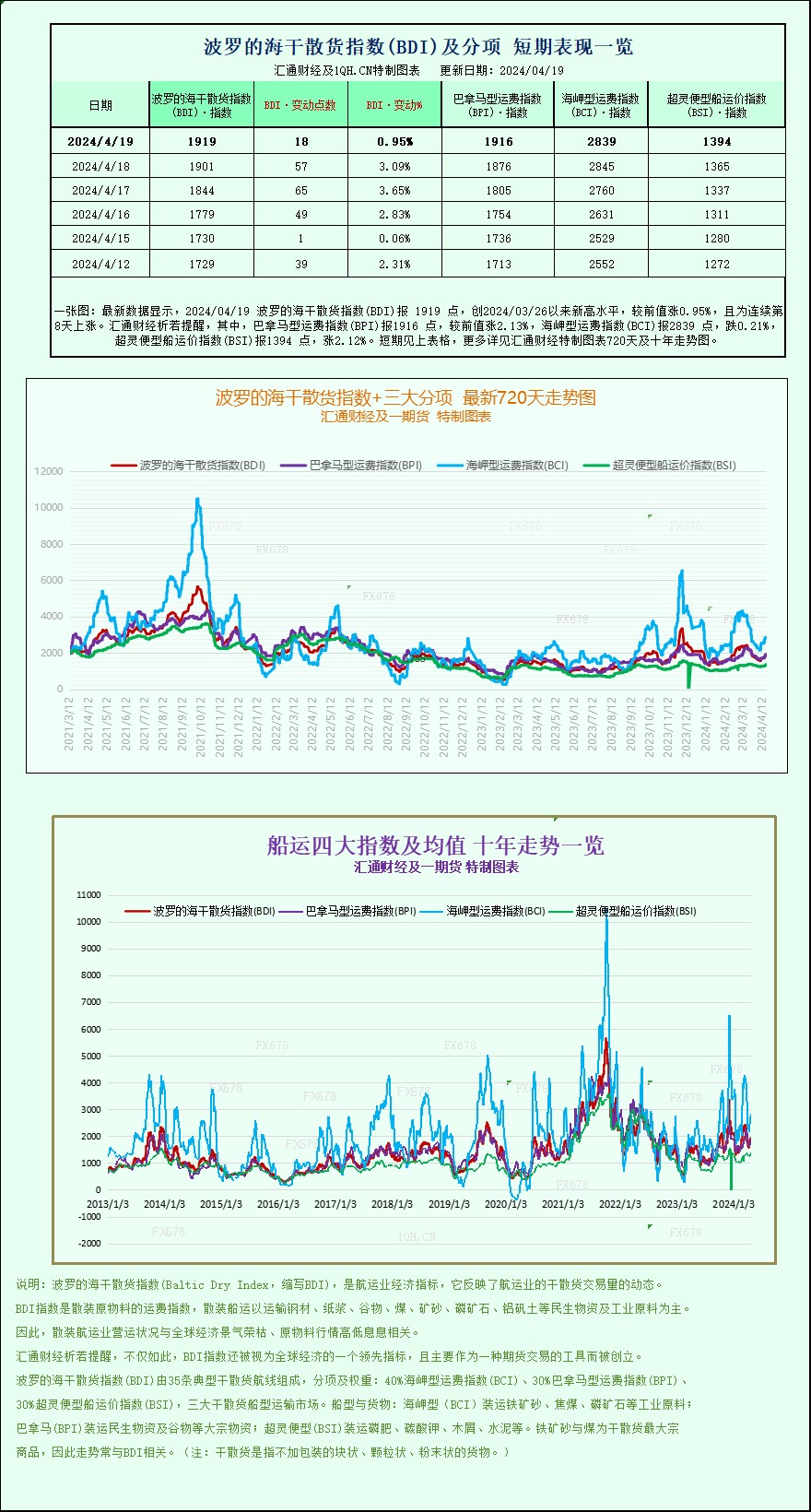 汇通财经APP讯——最新数据显示,2024/04/19 波罗的海干散货指数(BDI)报 1919 点,创2024/03/26以来新高水平,较前值涨0.95%,且为连续第8天上涨。其中,巴拿马型运费指数(BPI)报1916 点,较前值涨2.13%,海岬型运费指数(BCI)报2839 点,跌0.21%,超灵便型船运价指数(BSI)报1394 点,涨2.12%。波罗的海干散货指数+三大分项的最新720天走势图、十年走势图等详见汇通财经特制图表 。