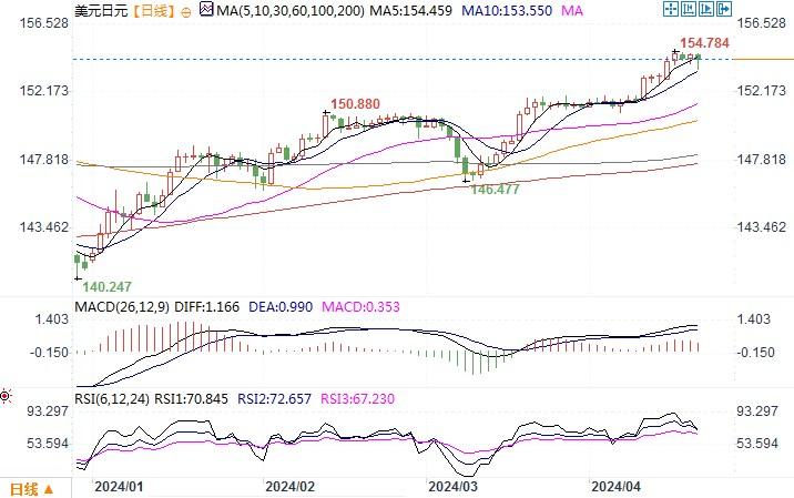 上涨0.1%收报154.58,距离周二触及的34年高位154.79不远。美国、日本和韩国财金领导人对日元和韩元急剧下跌发出警告,这令之前美元略承压,并让日元获得难得的喘息之机,但这一影响后来消散。主要是美国周四公布的一些经济数继续逞强,美元深受支撑。其中,美国上周初请失业金人数持平于21.2万人,预估为21.5万人。受助于新订单和制成品出货强劲,美国大西洋沿岸中部地区4月制造业活动扩张速度为两年来最快。费城联储4月企业状况指数从3月的3.2急升至15.5,远高于经济学家的估计中值2.3,甚至超过了接受调查的34位经济学家中最乐观的预测。美国数据几乎没有动摇人们对经济仍根基稳固的看法,这暗示美联储可能会将2020年以来首次降息的时间推迟到今年晚些时候。美元利率高企时间越延长,对日元的压力就不言而喻。目前美元/日元似乎仍被交易员尝试向155推进,以测试该水平到底会否招致日本当局的实际干预行为出现。因为,时至当下,虽然日本当局频繁发出口头警告,但市场干预行动却迟迟未见,这恐怕会继续助长套利交易驱动美元/日元往高点挺进。但还是此前笔者提到的,短线一定要时时防范日本当局甚至是多国联合干预出现的风险。