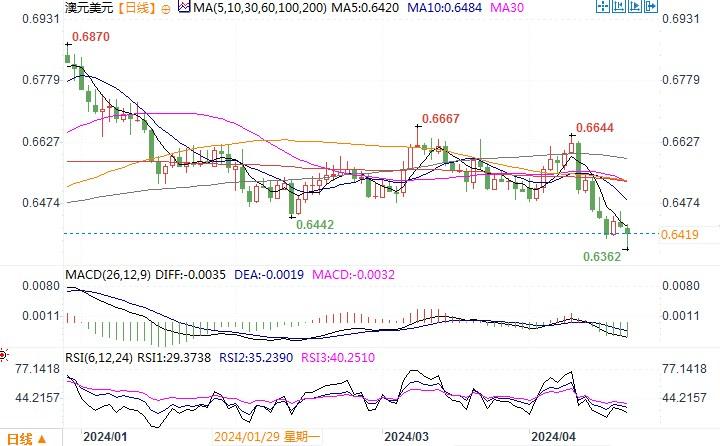 自周三的微弱反弹中再度回落,收盘于0.6420。周四数据显示,在经历了2月份的大幅增长之后,澳洲3月份的就业人口减少6,600人,不过失业率的上升幅度小于预期,表明劳动力市场仍然相对紧俏。数据使得有耐心的澳洲央行可能会在一段时间内保持观望。市场甚至已经削减了对澳洲行今年降息的押注,掉期交易暗示12月降息的可能性仅为65%,这意味着甚至今年降息一次也无法保证。如此一来,在息差因素方面,或许澳元还能多少获得些支撑。只是,近期美国数据太过于强势,且促进了美元的逞强表现,从而也继续压制着包括澳元在内一干非美货币的反弹表现。继续留意澳元/美元能否撑持在0.64之上,守稳则有望向上反弹。否则,澳元将会延续下滑的走势。