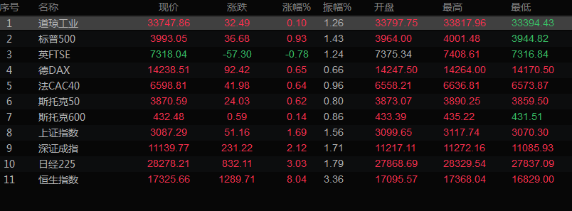 美股收盘情况:标普500指数上涨0.93%,收于3993.05点。纳斯达克指数大涨1.88%至11323.33点,而