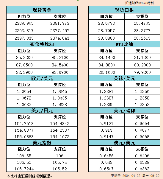 4月22日亚市支撑阻力:金银原油+美元指数等六大货币对