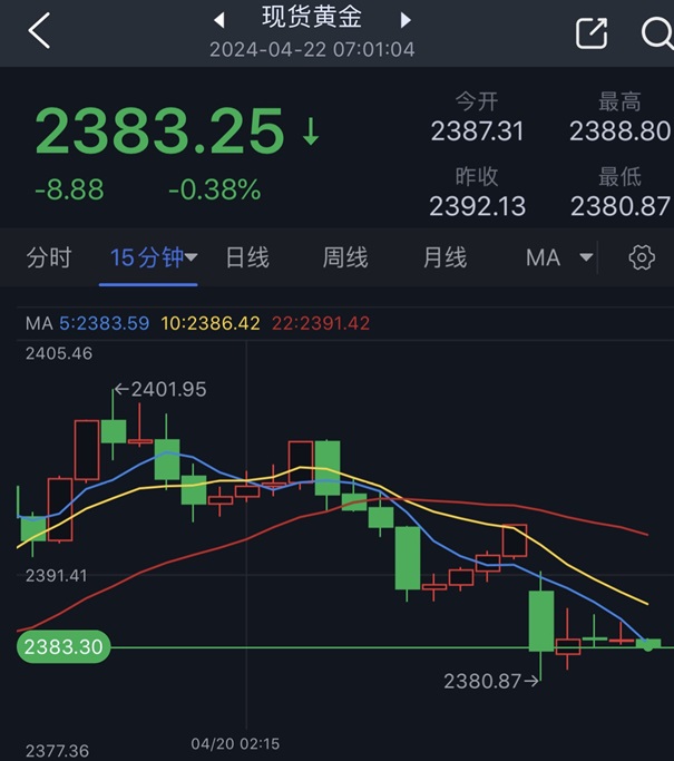 周一(4月22日)亚洲交易时段,现货黄金跳空低开,最低跌至2380.87美元/盎司,日内重挫逾11美元。分析师指出,围绕以色列与伊朗的紧张局势有所降温,这令避险情绪出现缓和,从而对金价构成打压。