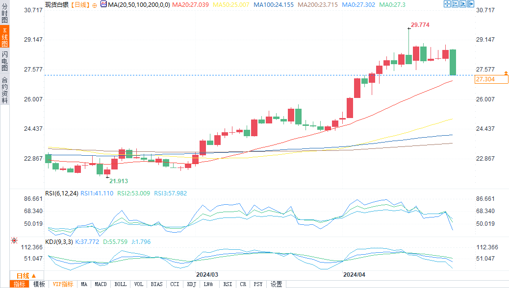 周一(4月22日),受地缘政治担忧、经济数据和投资策略转变等复杂因素的影响,银价大幅下跌。此前由于担心中东局势升级,银价一度飙升,但随着紧张局势似乎有所缓解,投资者缩减了白银和其他避险资产的头寸。