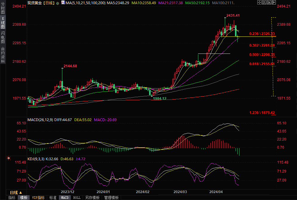 金价周二稍早曾触及4月5日以来最低2291.37美元/盎司,但尾盘收复大部分跌幅,收报2321.91美元/盎司,跌幅约0.2%。