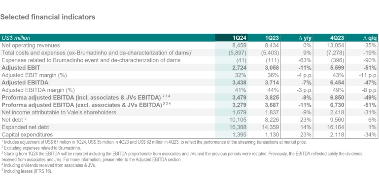 截至 2024 年 3 月 31 日的负债和租赁负债总额为 147 亿美元,环比增加 8 亿美元,主要系淡水河谷和 Vale Base Metals 于负债管理计划内获得新贷款所致。