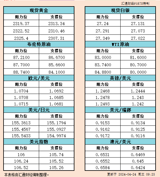 4月24日亚市支撑阻力:金银原油+美元指数等六大货币对