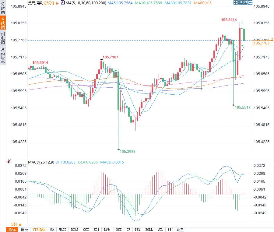 美元指数DXY短线下挫超22点,最低触及105.5517,后反弹约30点,收复数据公布后的所有跌幅最高触及105.8414点。