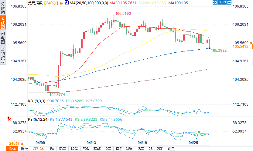 美元指数报105.56,跌幅0.01%。欧元/美元报1.0741,涨幅0.11%。英镑/美元报1.2526,涨幅0.11%。