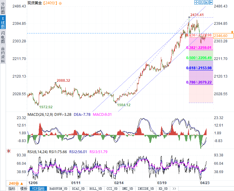 昨日黄金市场以高于2325.90美元/盎司的价格收盘,这一表现可能预示着市场对黄金的看空情绪有所减弱,价格有望恢复到主要的上升轨道。尽管如此,当前金价仍低于之前跌破的关键支撑位,这表明市场仍受到一些技术指标所暗示的下行风险的影响。