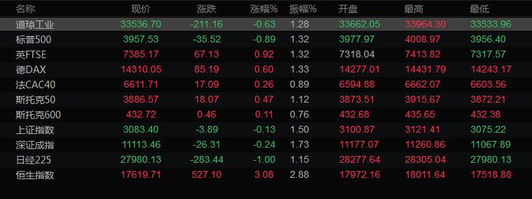 美股收盘情况:道琼斯工业指数下跌0.63%,报33536.7点,
