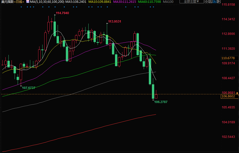 美元指数交投于106.87附近;美元周一上涨,此前美联储表示不会放松对通胀的打击,金价持稳,低吸买盘抵消了美元上涨带来的压力,白银跳涨1.5%,至每盎司22美元,触及6月9日以来最高。