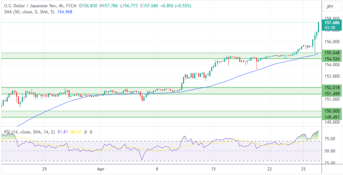 因此,交易员押注除非美元/日元测试160.00水平,否则日本央行不会干预。需要注意的是,RSI处于极度超买区域,因此回调的风险正在增加。