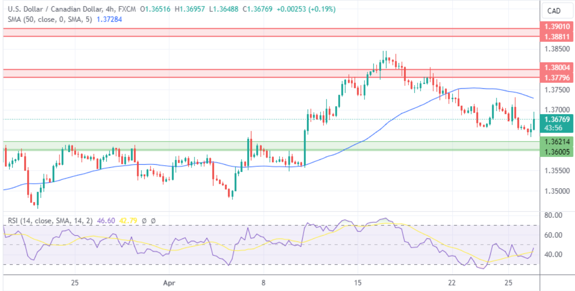 如果美元/加元升至50日移动均线1.3728上方,它将向阻力位1.3780–1.3800移动。