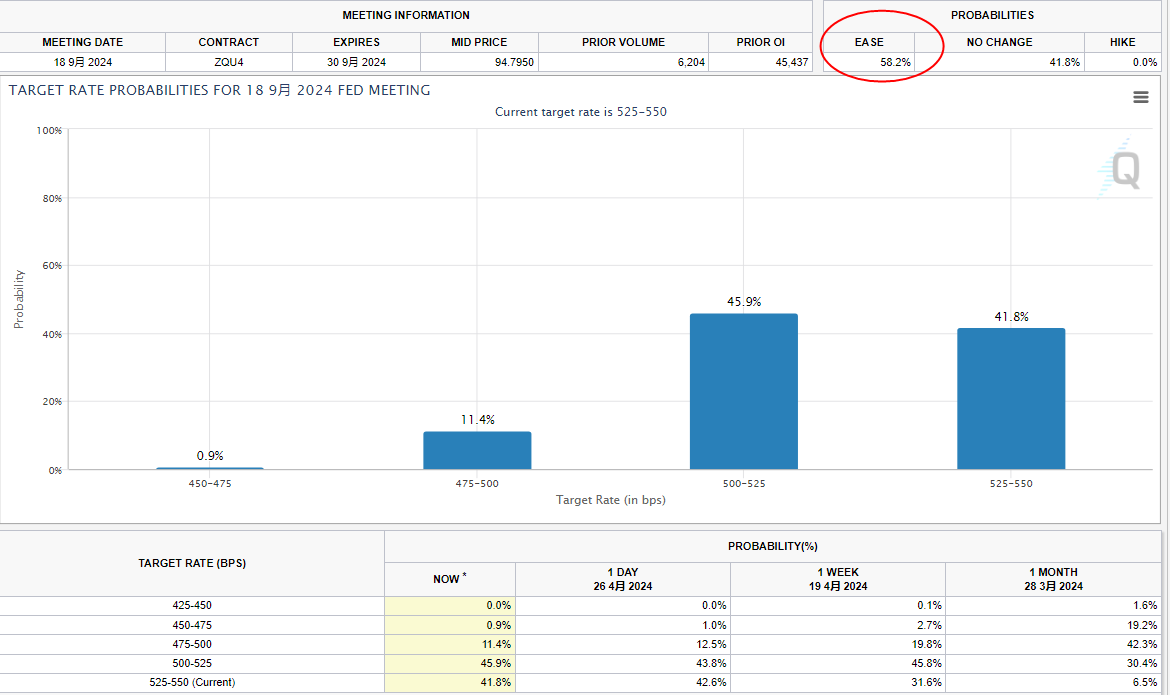 据CME FedWatch,美联储5月降息25个基点的概率为2.5%;美联储到6月维持利率不变的概率为88.2%,累计降息25个基点和50个基点的概率分别为11.5%、0.2%;美联储到7月份维持利率不变的概率为74.6%,累计降息25个基点和50个基点的概率分别为23.4%、2%;美联储到9月维持利率不变的概率为41.8%,累计降息25个基点、50个基点和75个基点的概率分别为45.9%、11.4%、0.9%。