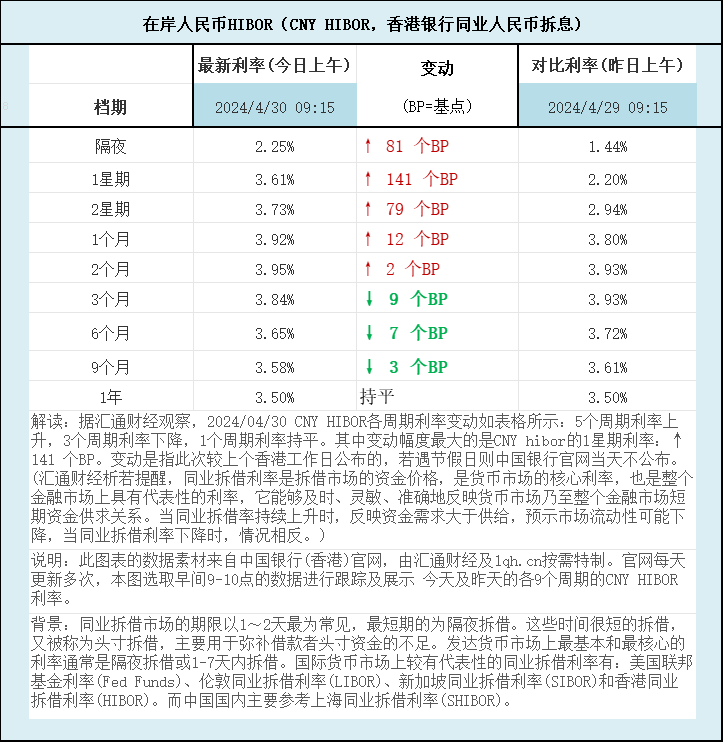 标题:人民币香港银行间同业拆借利率(CNY HIBOR)及变动一览:据汇通财经观察,2024/04/30 CNY HIBOR各周期利率变动如表格所示:5个周期利率上升,3个周期利率下降,1个周期利率持平。其中变动幅度最大的是CNY hibor的1星期利率:↑ 141 个BP。如图更新的数据显示,隔夜在岸人民币HIBOR报2.25%,升81个BP;1星期报3.61%,升141个BP,2星