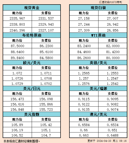 4月30日亚市支撑阻力:金银原油+美元指数等六大货币对