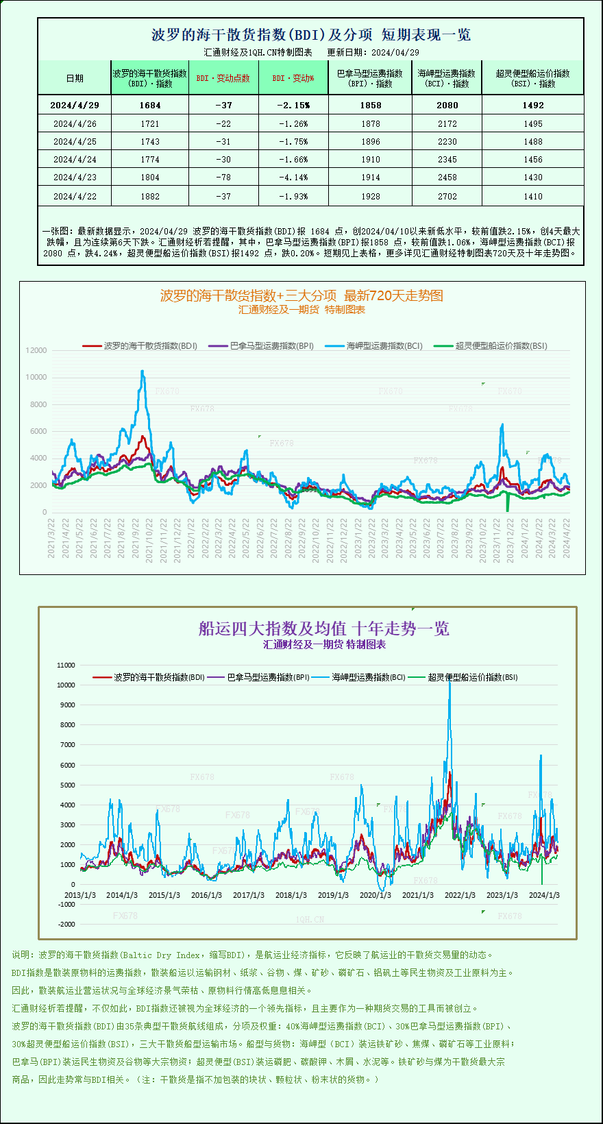 汇通财经APP讯——最新数据显示,2024/04/29 波罗的海干散货指数(BDI)报 1684 点,创2024/04/10以来新低水平,较前值跌2.15%,创4天最大跌幅,且为连续第6天下跌。其中,巴拿马型运费指数(BPI)报1858 点,较前值跌1.06%,海岬型运费指数(BCI)报2080 点,跌4.24%,超灵便型船运价指数(BSI)报1492 点,跌0.20%。波罗的海干散货指数+三大分项的最新720天走势图、十年走势图等详见汇通财经特制图表。